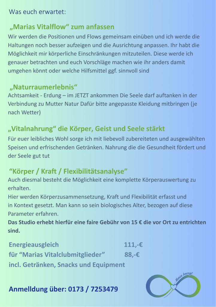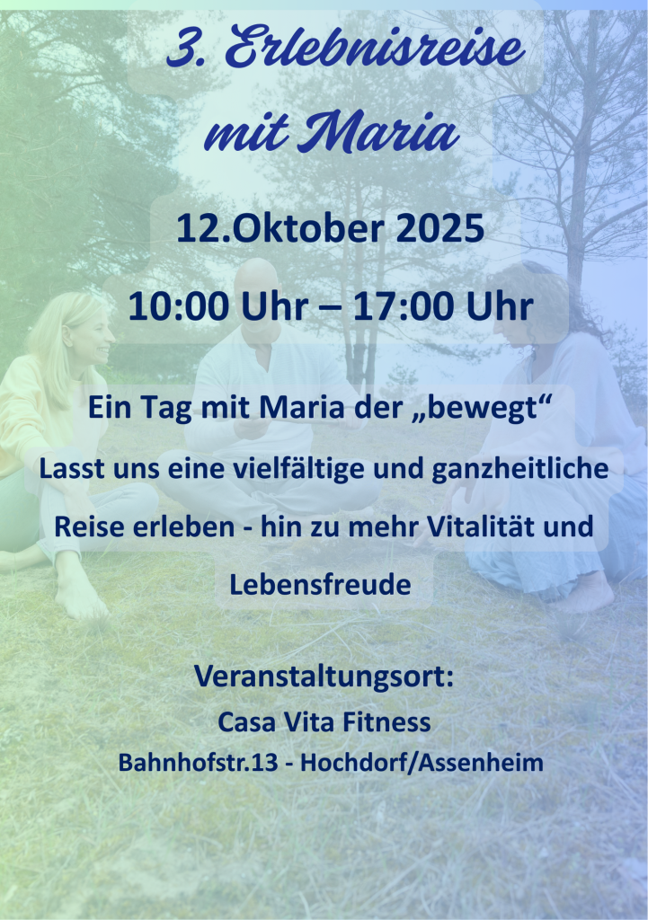 Ich bin absolut begeistert von diesem Kurs! Die Mischung aus Bewegungsübungen, zur Vitalisierung und stärkung der Muskelkraft ist einfach perfekt. Jede Einheit ist abwechslungsreich und motivierend, und ich spüre, wie mein Körper davon profitiert! Maria ist äußerst kompetent und einfühlsam, sie schafft eine positive und unterstützende Atmosphäre. Neue Energie und Lebensfreude werden frei. Dieser Kurs ist ein wahrer Gewinn für Körper und Geist!" Natascha Seibel